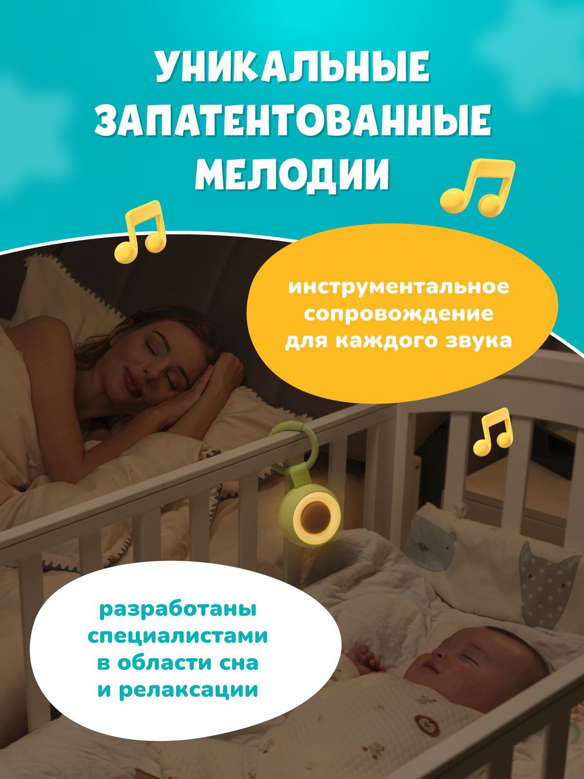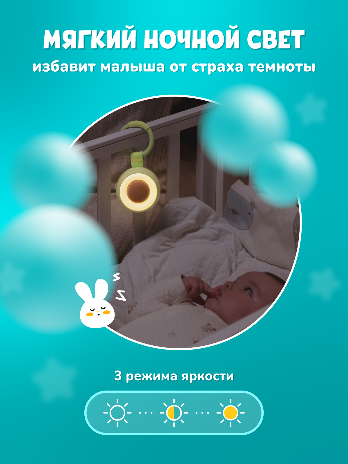 - Индивидуальные настройки. Регулируемая громкость и 3 режима свечения (слабый, яркий и затухающий) для создания расслабляющего освещения в спальне или детской.