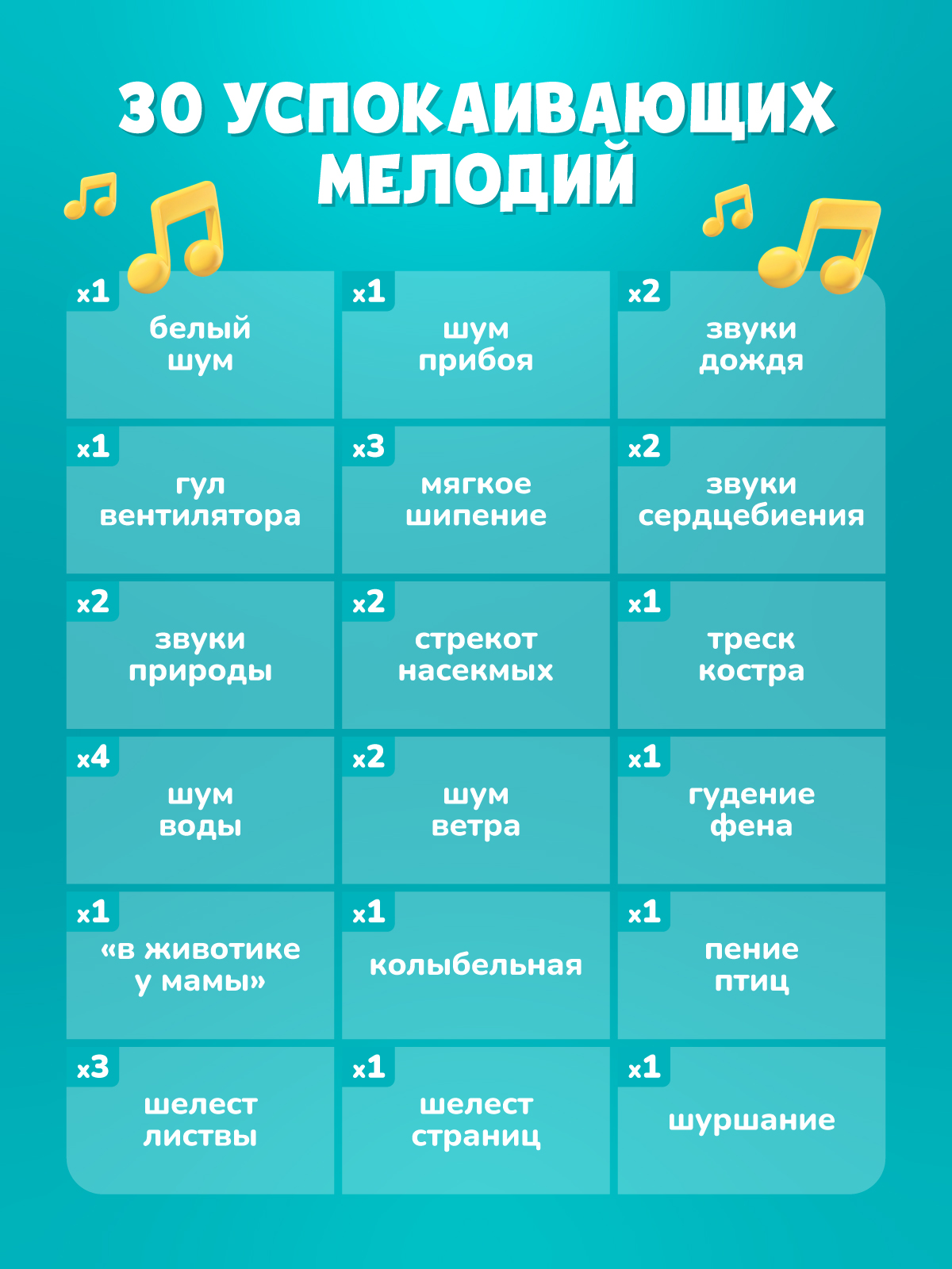 - Звуковая палитра для релаксации. 30 запатентованных мелодий: умиротворяющие звуки природы (треск костра, стрекот цикад и т.д.) и звуки окружающей среды (мерный гул фена, шелест страниц и т.д.), а также белый шум для новорождённых с уникальным инструментальным сопровождением. Они подходят для медитаций и дыхательных практик или в качестве фона для спокойного детского сна.