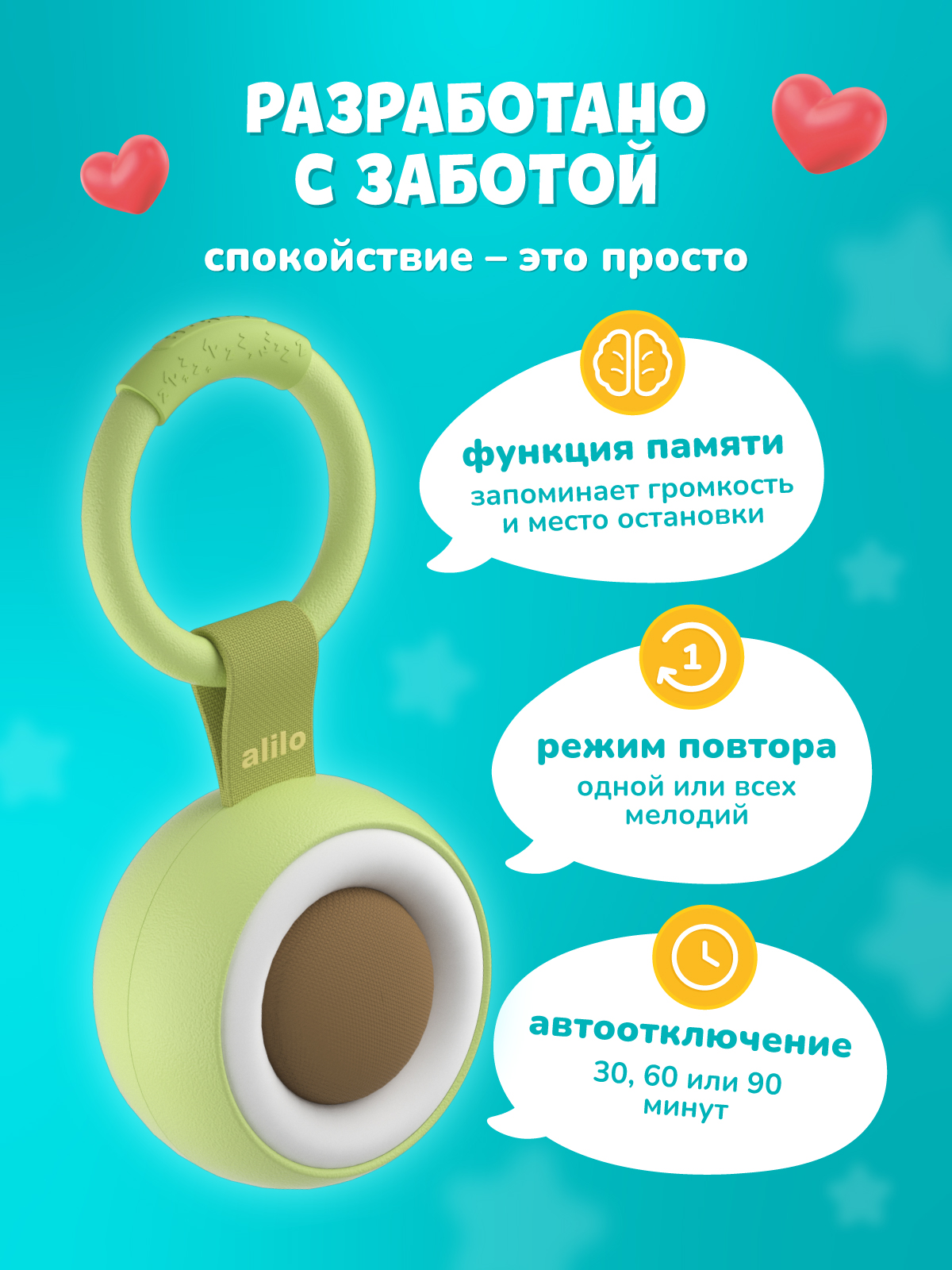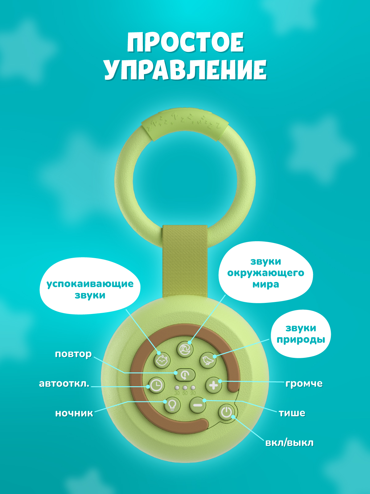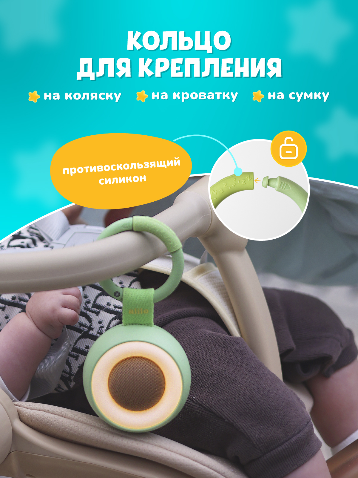 - Компактность и мобильность. Диаметр всего 8,3 см, удобно лежит в ладони. Есть кольцо для крепления на коляску, кроватку или сумку.
