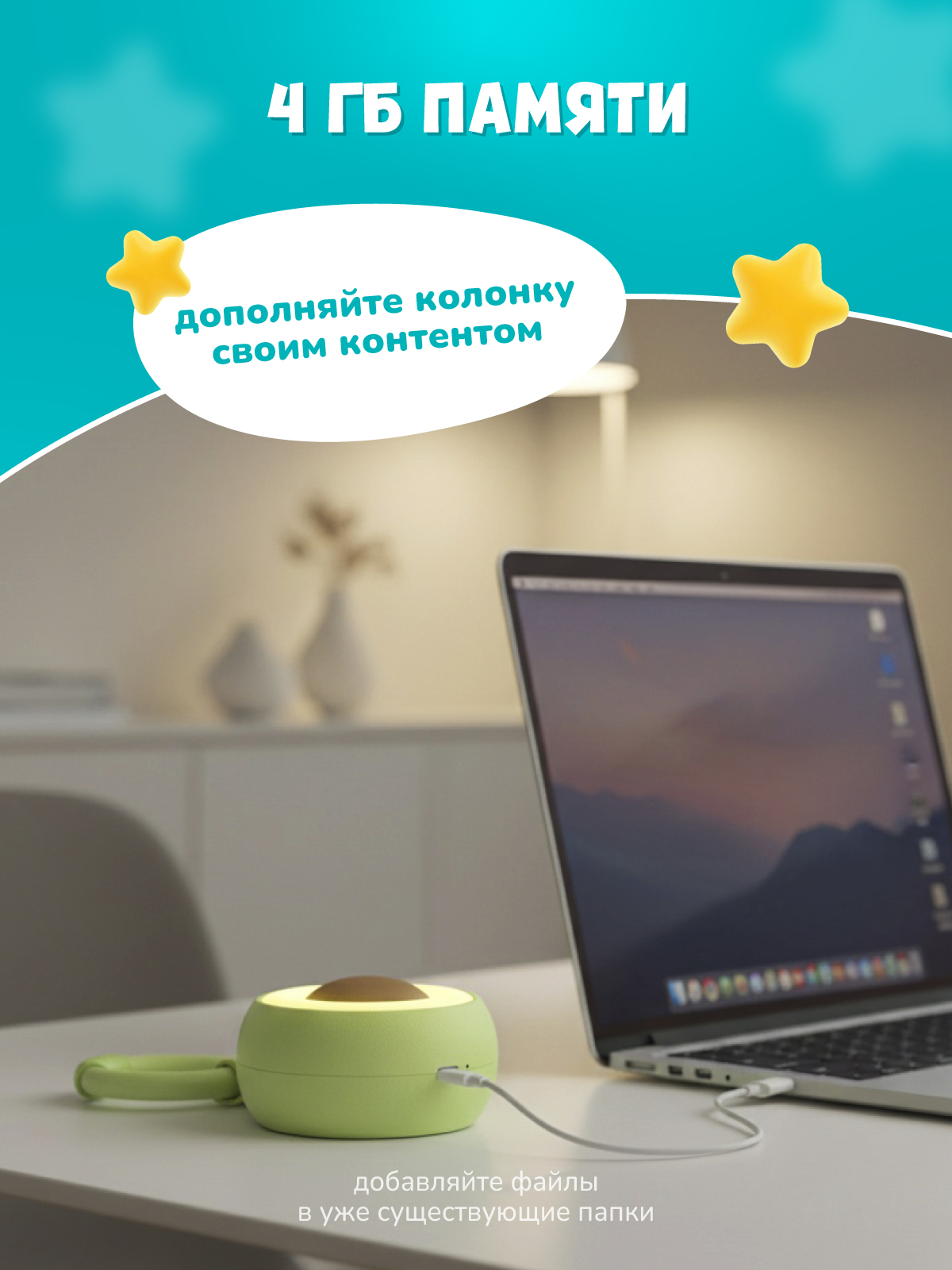 - Персональная аудиобиблиотека. Используйте свободное место в общей памяти 4 ГБ под свой контент. Загрузите плейлисты для йоги или колыбельные малыша. Это открывает безграничные возможности для кастомизации ночника, позволяя создать идеальную атмосферу для любых задач.