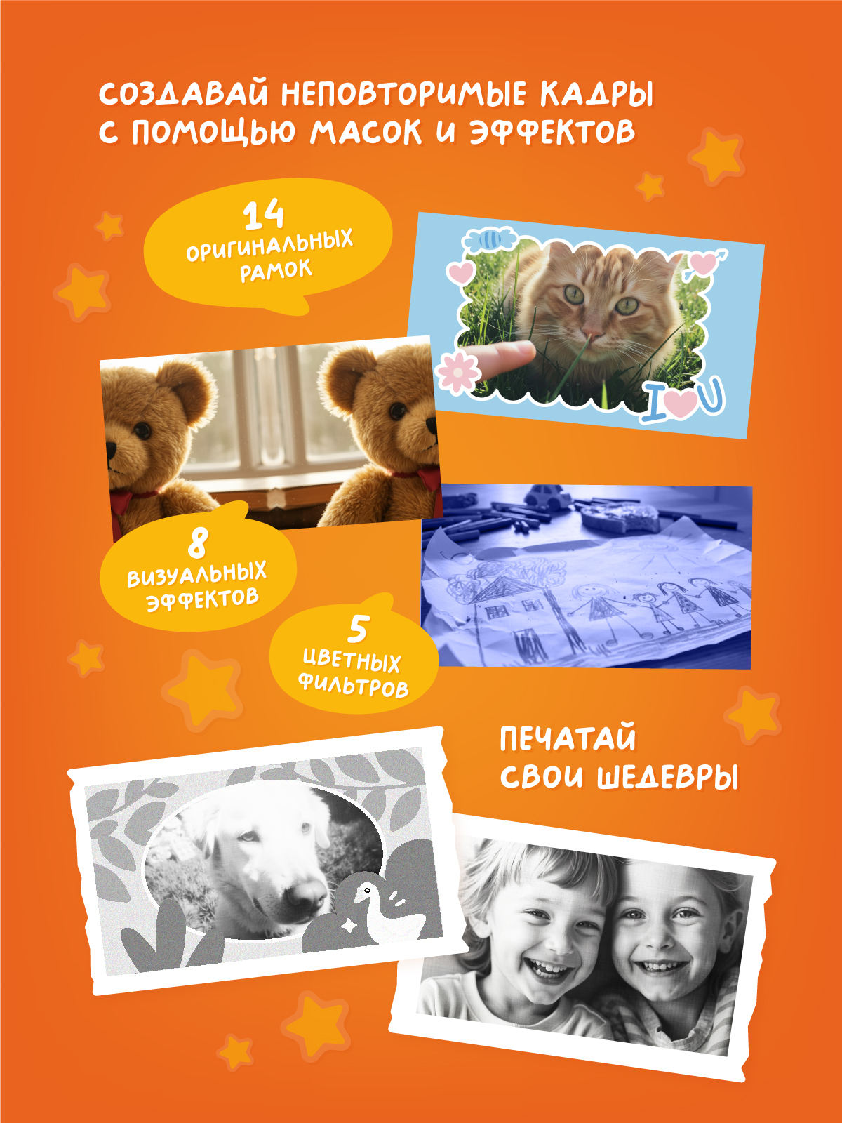 С этим фотоаппаратом ребёнок легко раскроет творческий потенциал и создаст свои первые уникальные фотографии. Моментальная печать делает творчество осязаемым, а поворотная камера позволяет легко сделать яркие и качественные селфи.