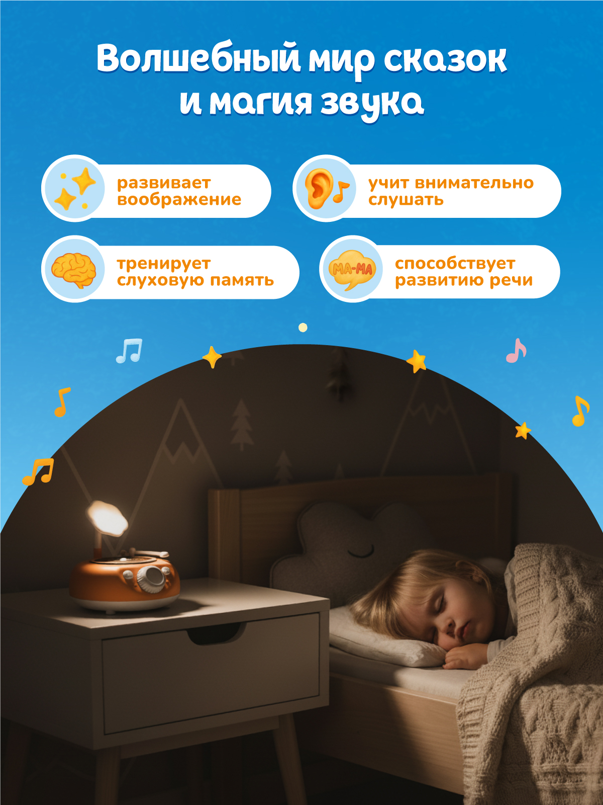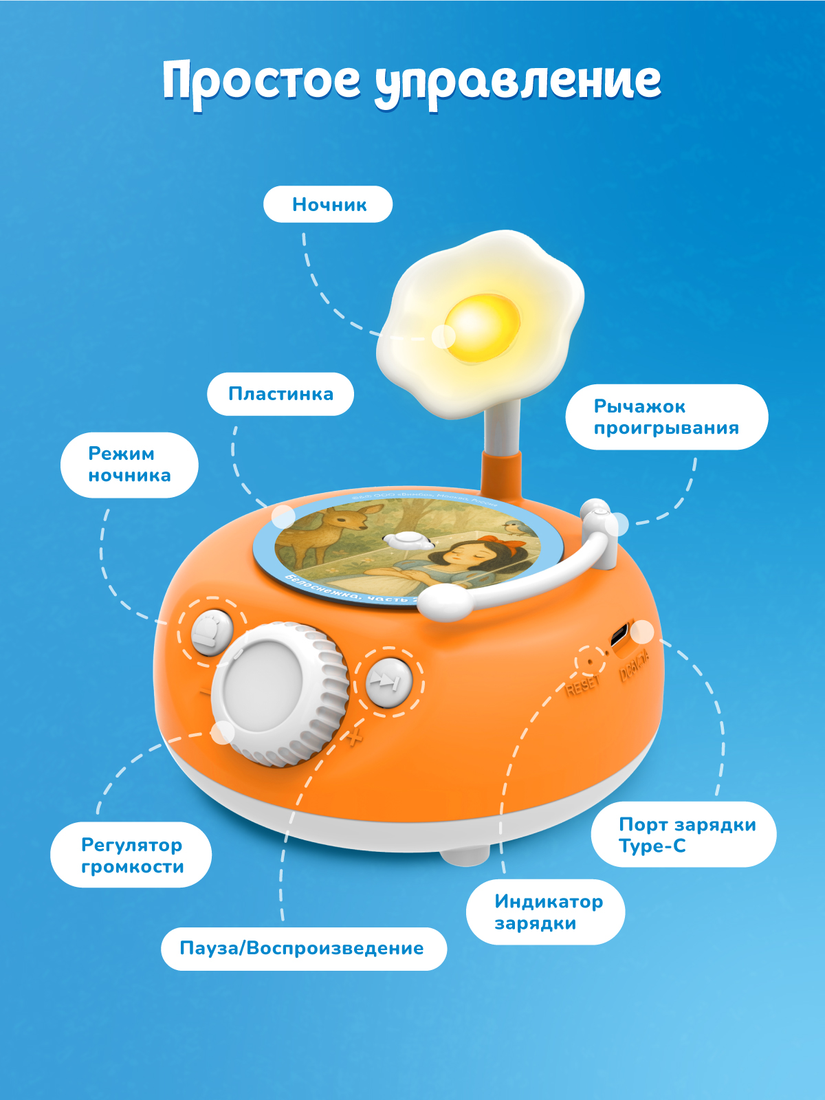 -- Уютная подсветка. Мягкий свет превращает граммофон в ночник для комфортного прослушивания сказок перед сном.
