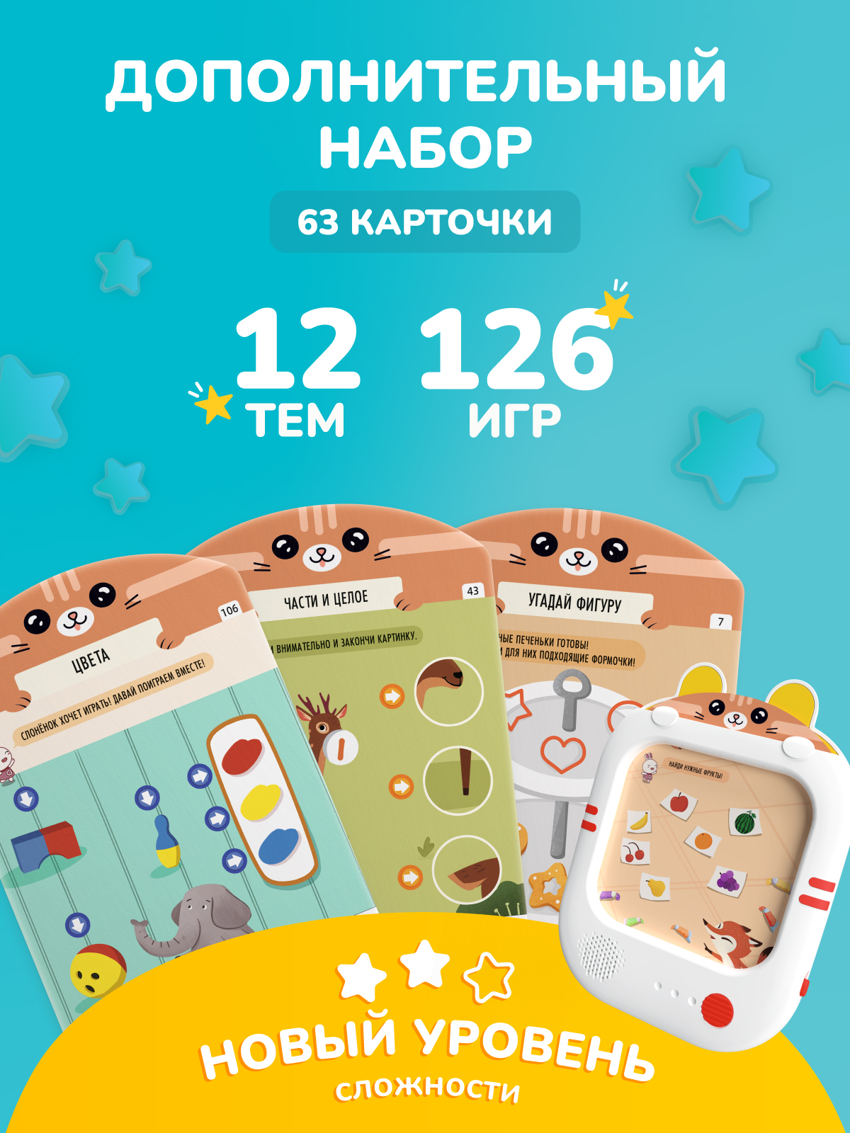 - 63 двусторонние карточки в дополнительном наборе. 12 тем для изучения: фигуры, цвета, пространство, цифры, счёт и т.д.;