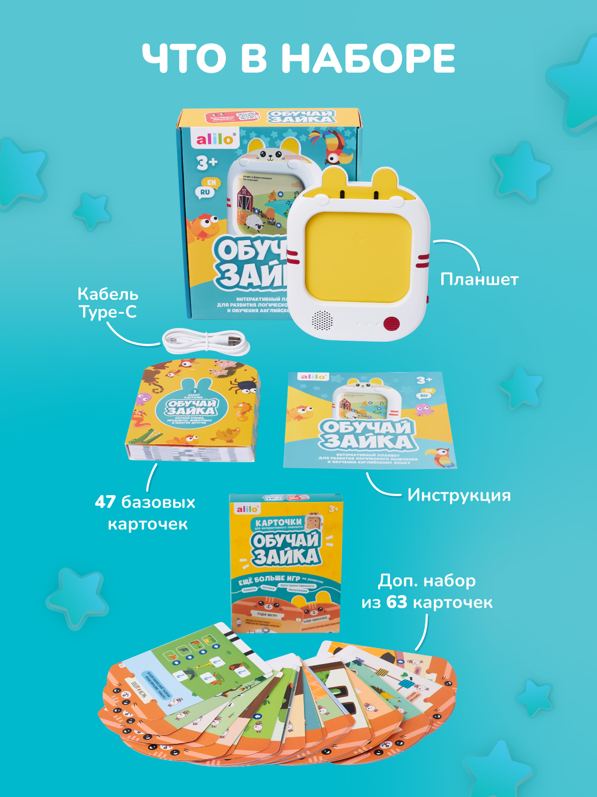 Обучай-Зайка alilo – детский интерактивный развивающий планшет с дополнительным набором карточек. Специально для любознательных малышей от 3 лет!