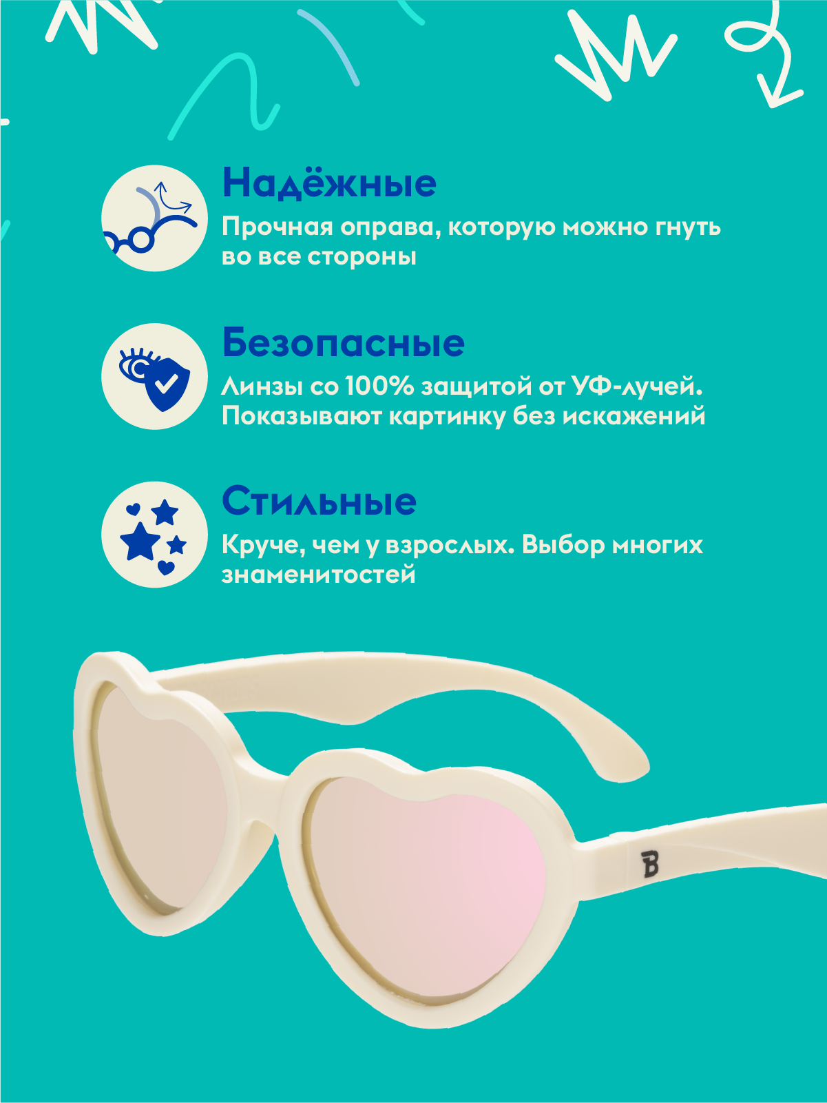 Получившие множество наград солнцезащитные очки Babiators (Бэйбиаторы) - самые стильные очки для любознательных малышей, ищущих приключения. Оправа этих очков сделана из гибкого прорезиненного материала. Они обеспечивают 100% защиту от солнца, и именно их носят детишки многих знаменитостей во всём мире.