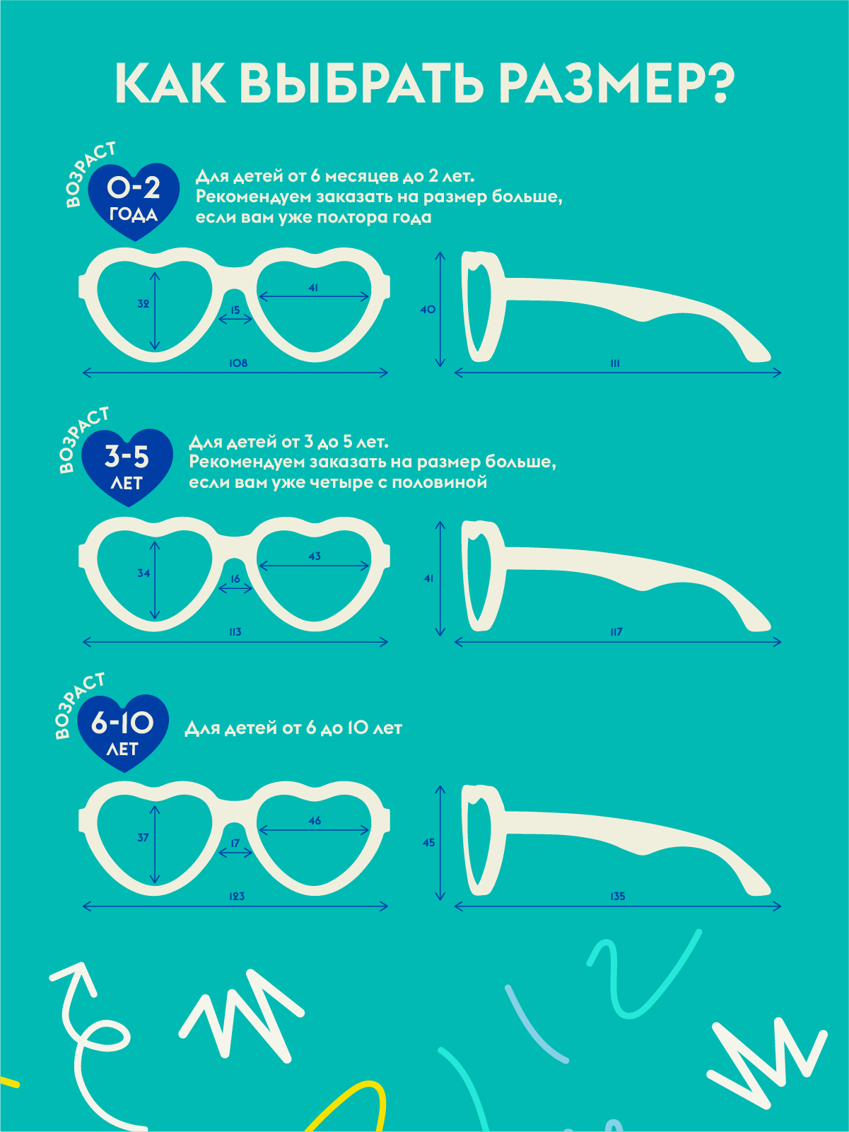 Размер 3-5: Длина оправы 11 см. Высота оправы 4 см. Длина дужек 11 см.