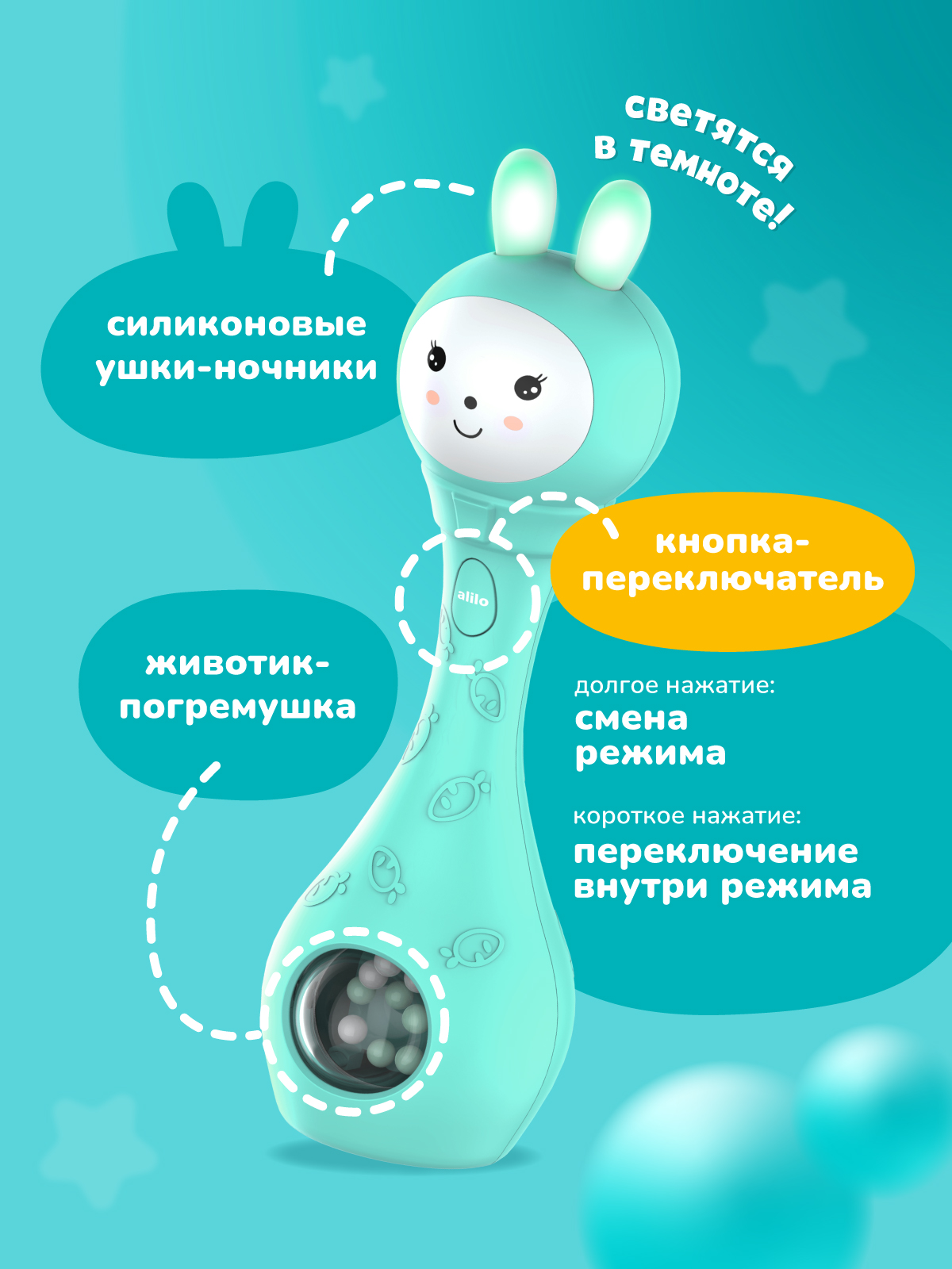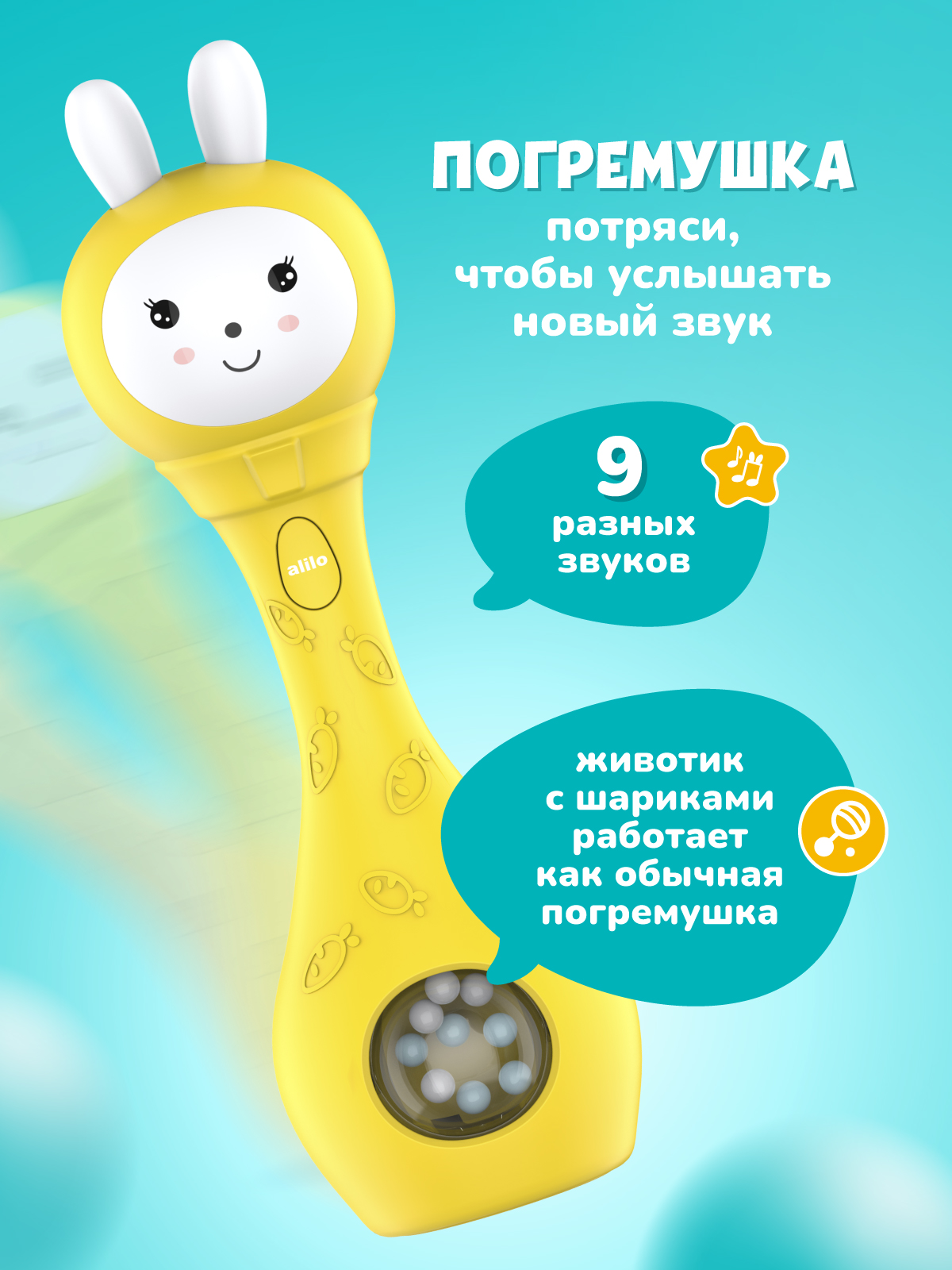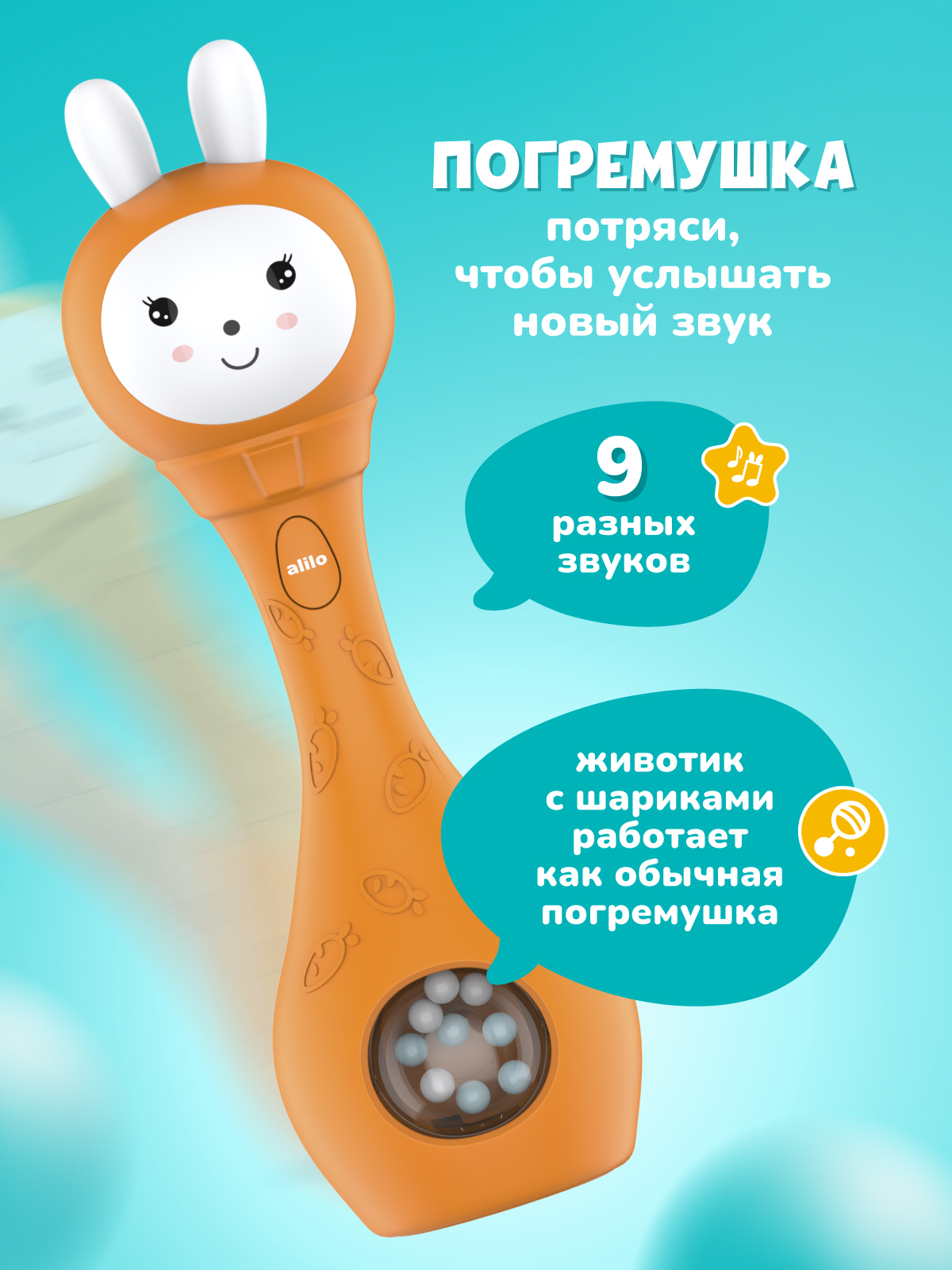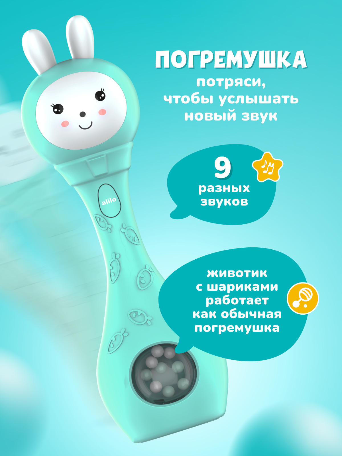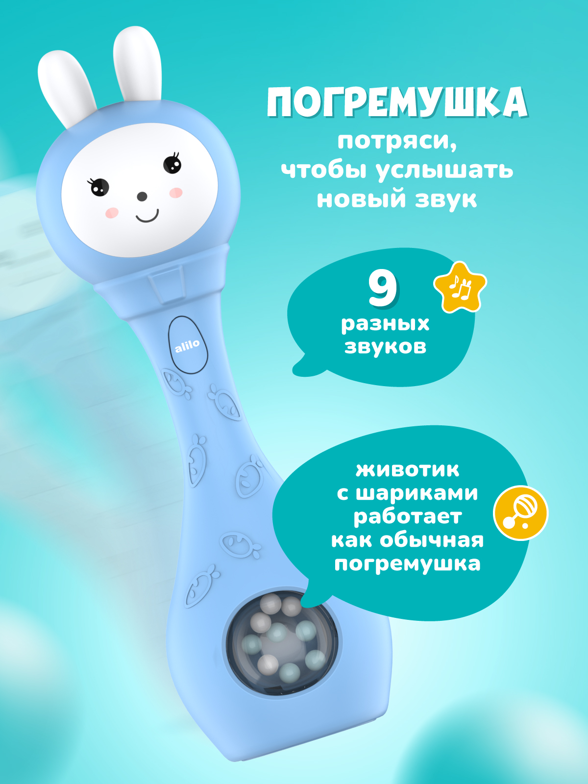 Со мной можно играть как с обычной погремушкой, а можно включить и услышать много разных звуков, весёлых мелодий или сладко поспать под спокойную музыку или белый шум.