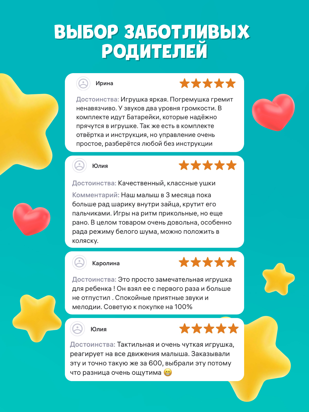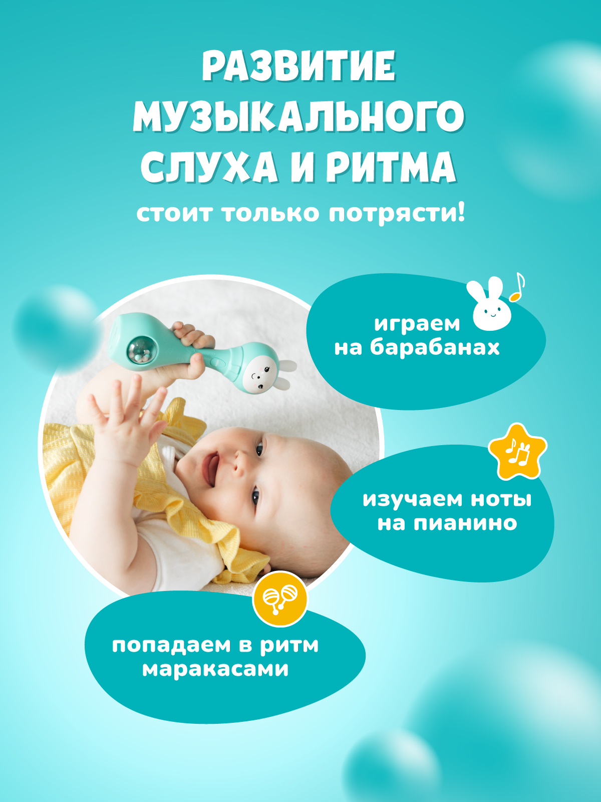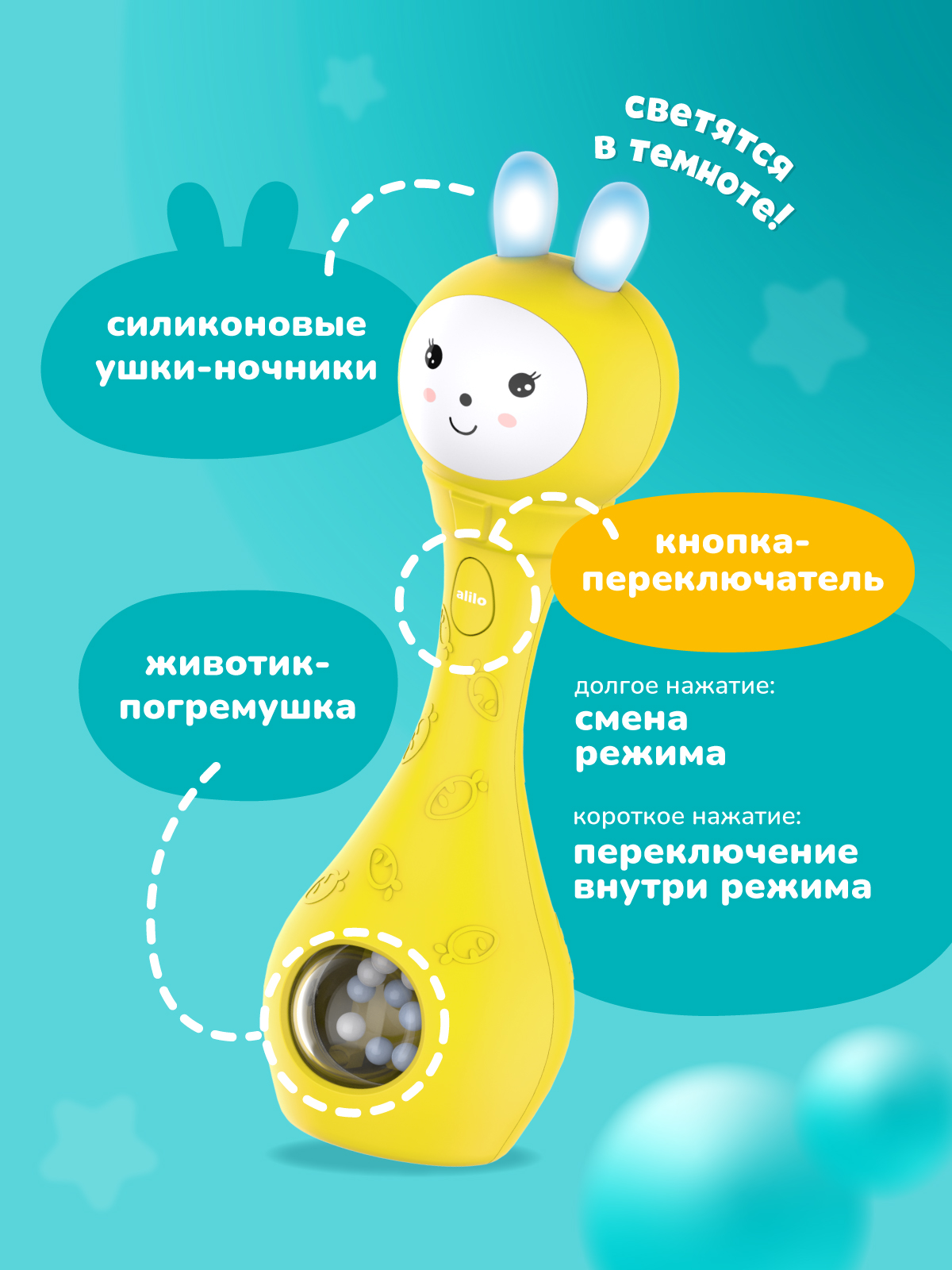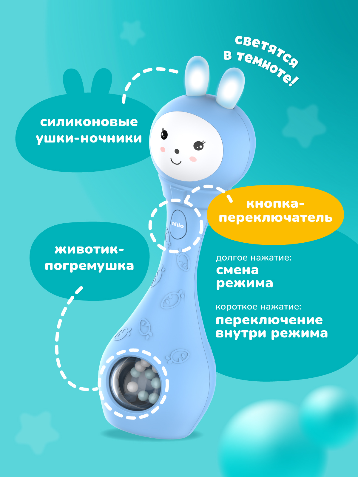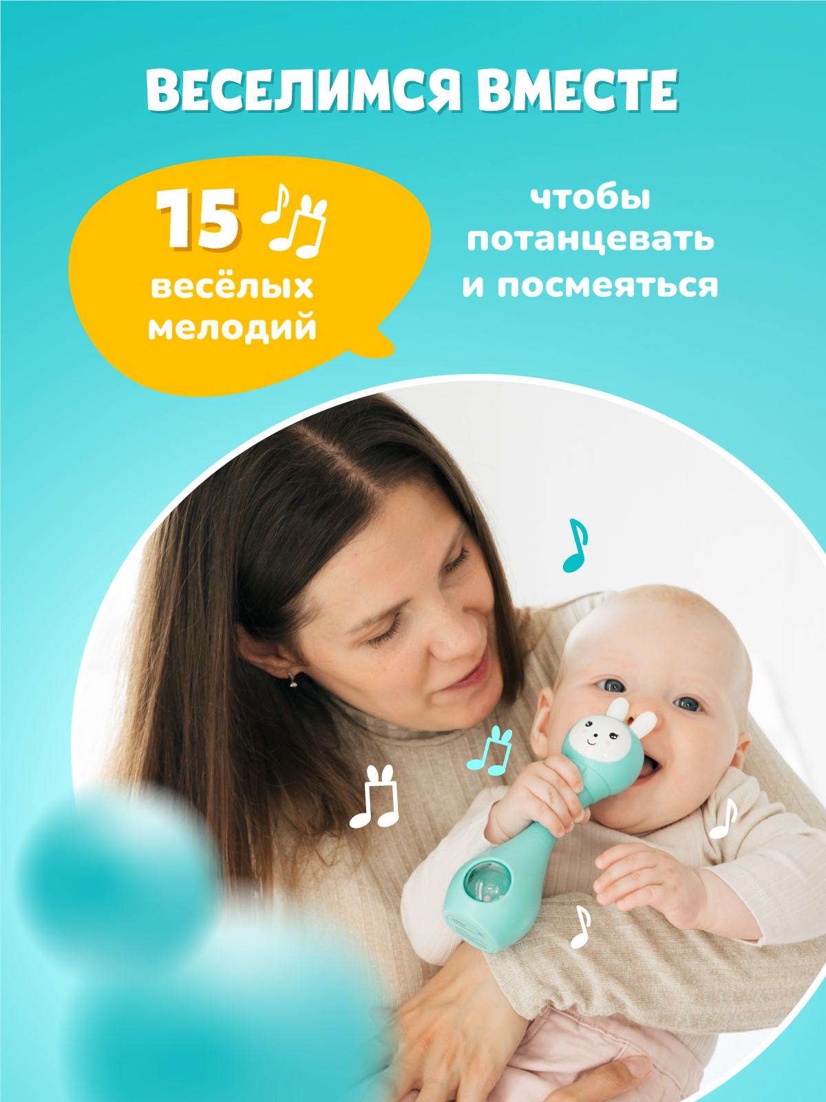 Со мной можно играть как с обычной погремушкой, а можно включить и услышать много разных звуков, весёлых мелодий или сладко поспать под спокойную музыку или белый шум.